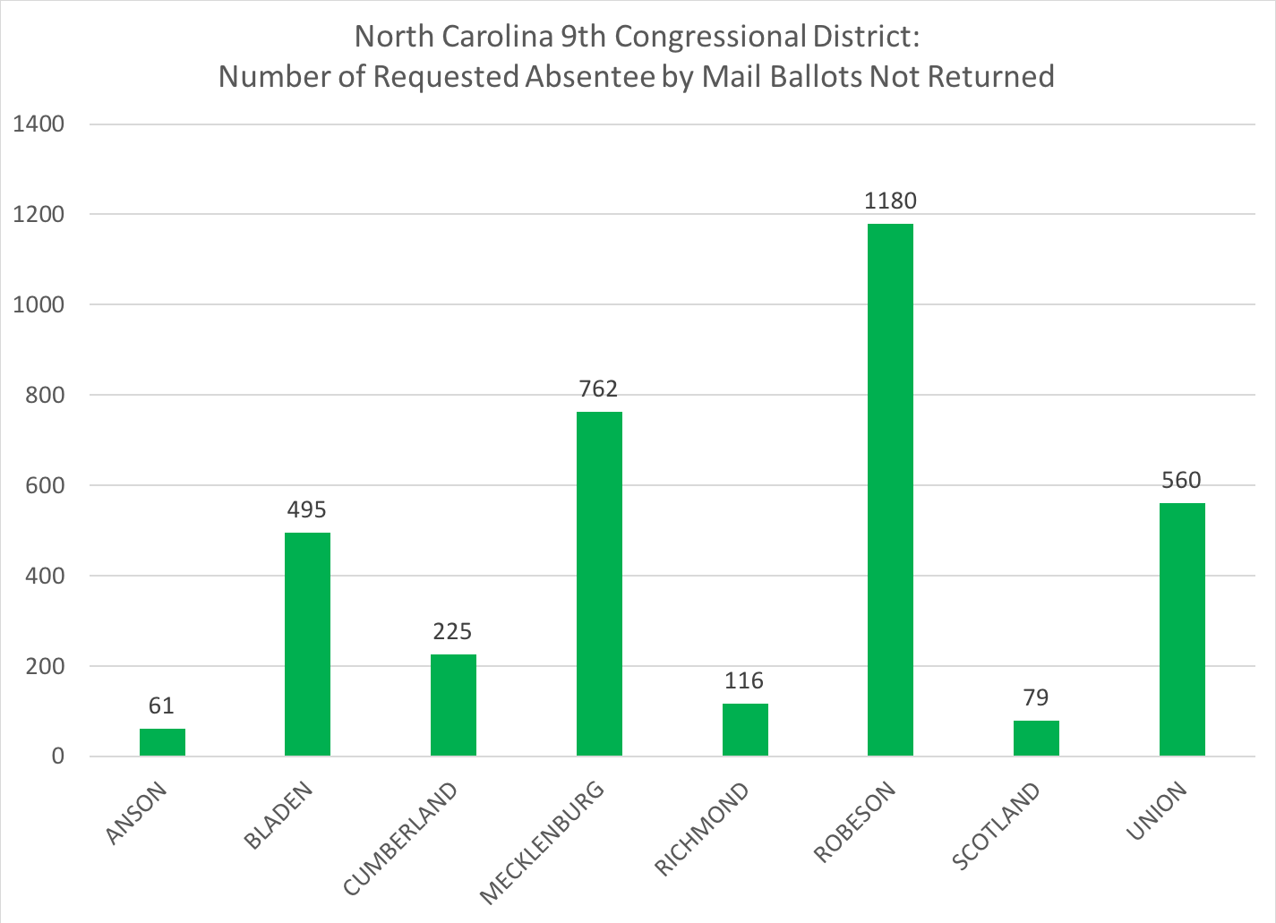 Based on this new information, I went back to the above chart and looked at the raw numbers of absentee by mail ballots that were requested but not returned for the eight counties in the NC 9th Congressional District: