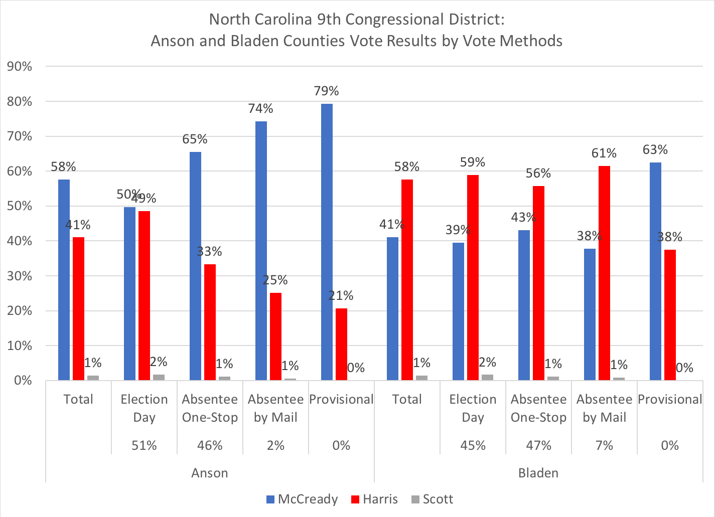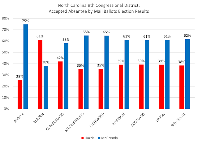 In Bladen County, 61 percent of the accepted absentee by mail ballots went Republican--the only county to do so; meaning that along with the almost 20 percent of loyal registered Republicans who voted that method, Harris would have also received almost all the registered unaffiliated voters and/or some Democratic registered voters to make it to 62 percent of the vote.