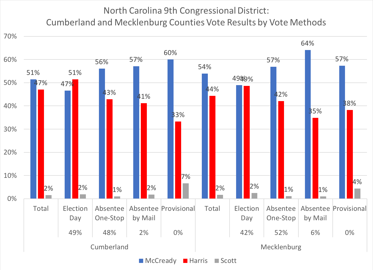 As is the case in almost all of the counties, with the exception of Bladen's provisional ballots, Cumberland's Election Day, and Union's absentee by mail ballots, the county winner generally won amongst the various vote methods in that county.