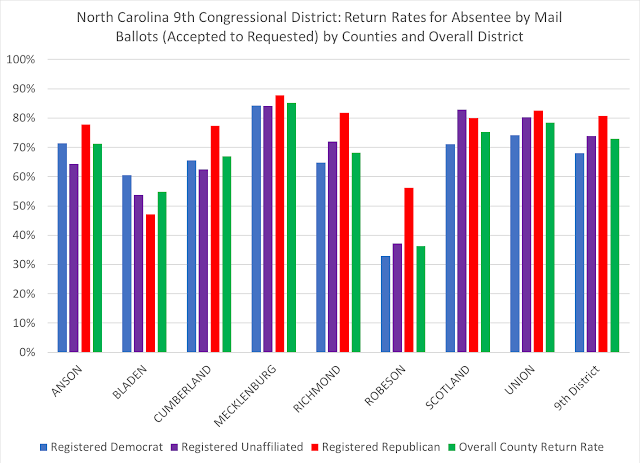 Robeson County saw nearly two-thirds of its requested absentee by mail ballots not returned, while Bladen had 40 percent of its requested mail ballots not returned. A quarter of the entire district's requested mail absentee ballots were not returned.