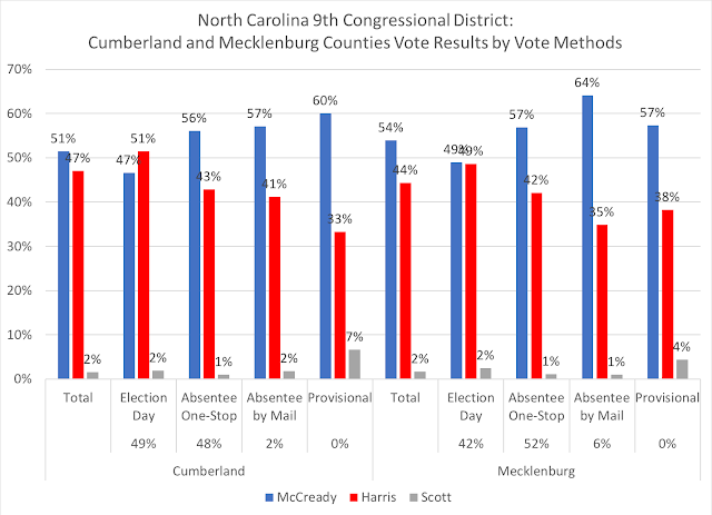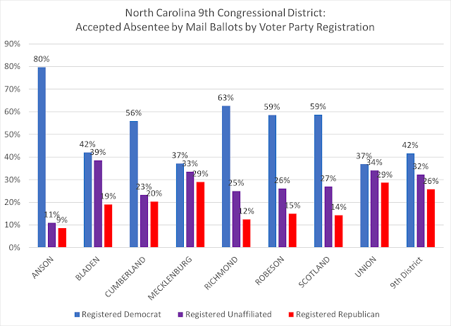 In comparison, in Anson County, Democrat McCready got 75 percent of the absentee by mail ballots, where 80 percent of that vote method came from registered Democrats--again, some likely party defectors in a rural county. In Cumberland, registered Democrats were 56 percent of the absentee by mail ballots accepted, with McCready winning 58 percent of that county's mail ballots.