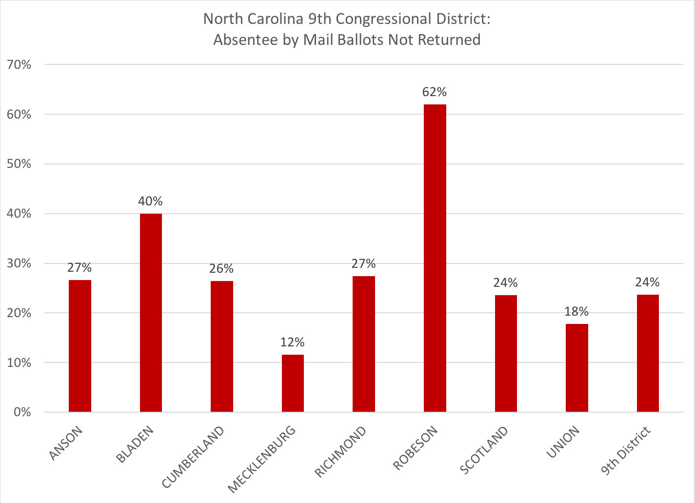Within Robeson County, 62 percent of the requested absentee by mail ballots were not returned, making it the highest county in the 9th District with that non-return rate percentage. The county with the second highest non-return rate percentage of requested ABMs in the 9th was Bladen County.