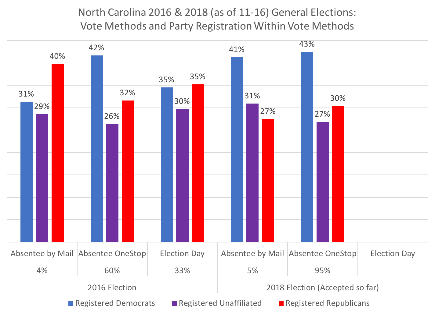 The following charts show the three primary methods--absentee by mail, absentee one-stop/in-person, and Election Day--and the party registration of voters using those methods to cast their ballots. Distinct trends are evident in both presidential and mid-term elections in North Carolina: