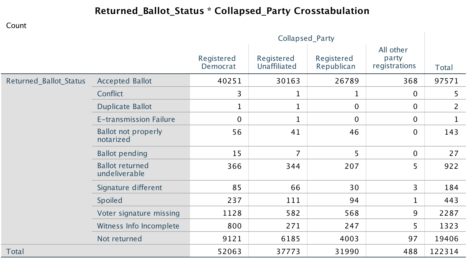 For the specific numbers by party, the following gives the cross-tab analysis conducted in SPSS of all requested ABMs from across the state with the returned ballot status (accepted, rejected and the various reasons, and those not returned):