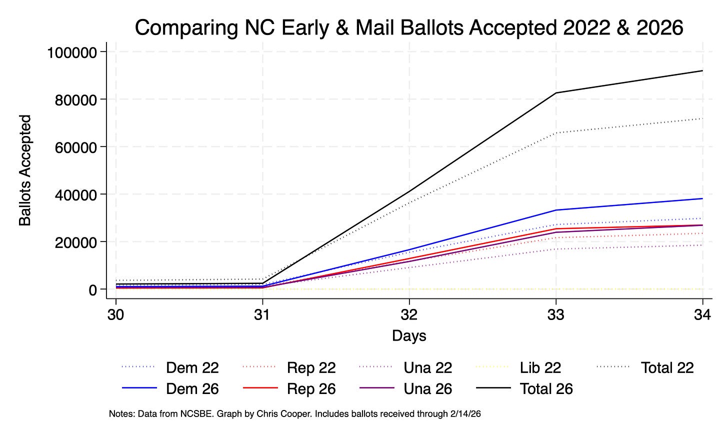 Last Thursday (February 12, 2026) marked the beginning of in person early voting in North Carolina. So, where do we stand and what should we watch?