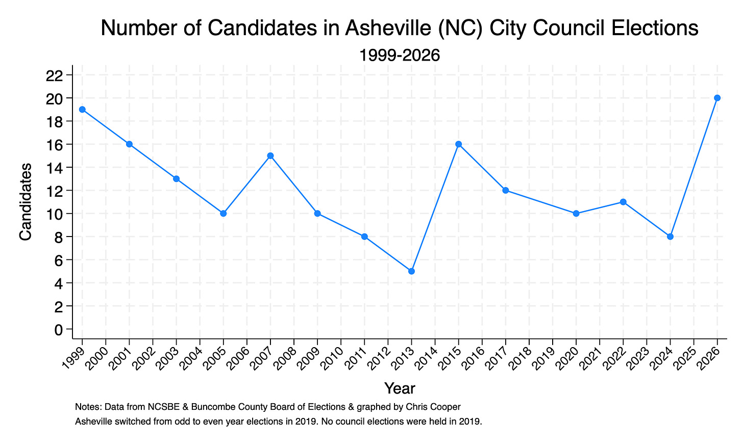 Asheville city council. A whopping 20 (!) candidates are running for three seats on the Asheville City Council. Voters select three candidates; the top six vote-getters9 will advance to November’s General Election. These elections are non-partisan (there won’t be a D or R on the ballot), but in reality, this is a pretty left-leaning bunch. Incumbents Maggie Ullman, Sheneika Smith and Antanette Mosley are running for re-election but it’s hard to handicap their odds, given the size of the field. Mosley has been accused of, among other things, not living in the city (or in the state) and voting in multiple states. Primaries are always unpredictable—primaries with 20 candidates? Your guess is as good as mine.