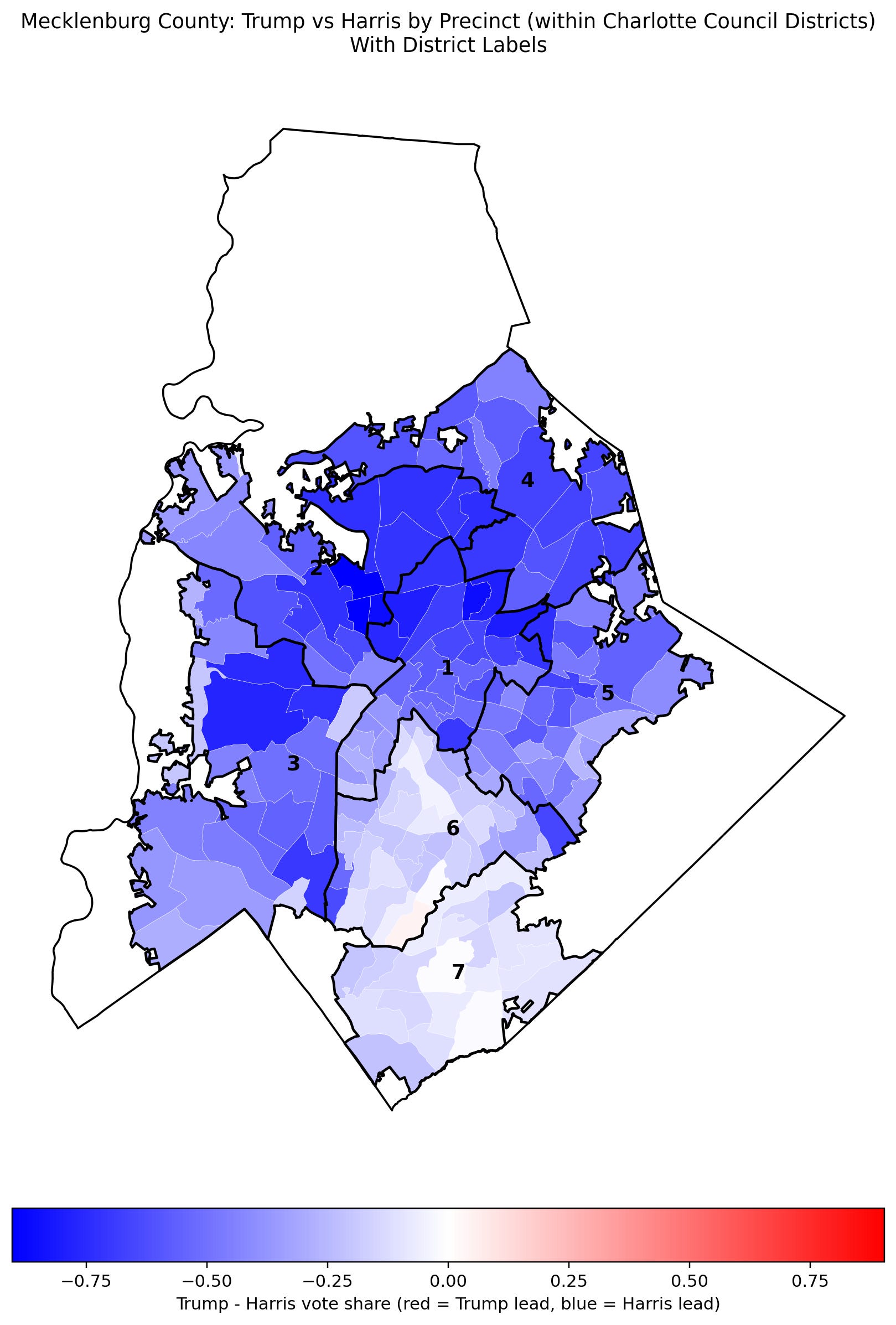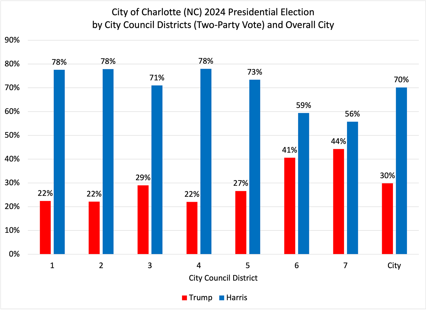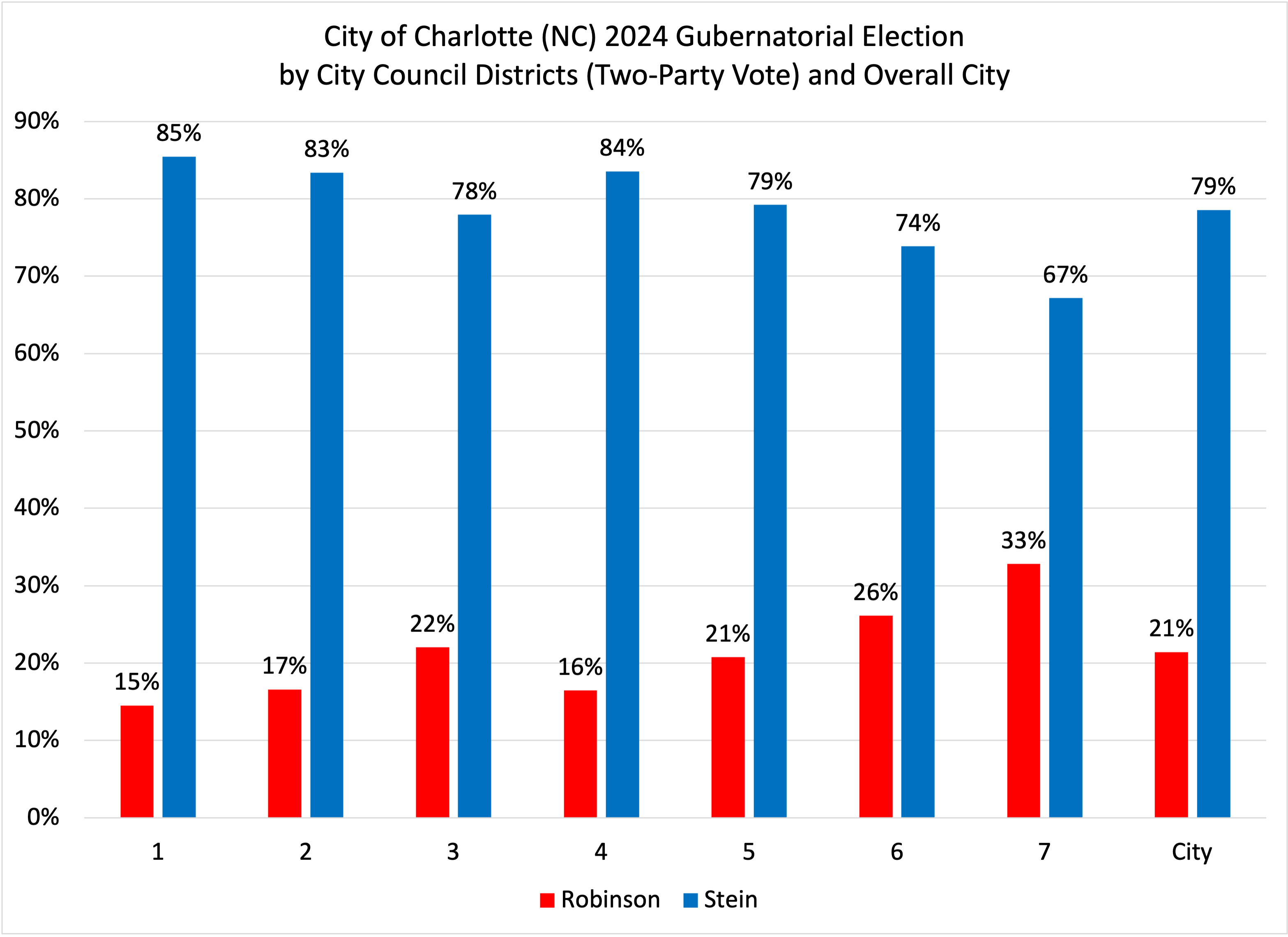 In taking the Mecklenburg County precincts that make up the seven Charlotte city council districts and analyzing them based on the 2024 presidential and gubernatorial two-party vote, one can see this dominance in full: