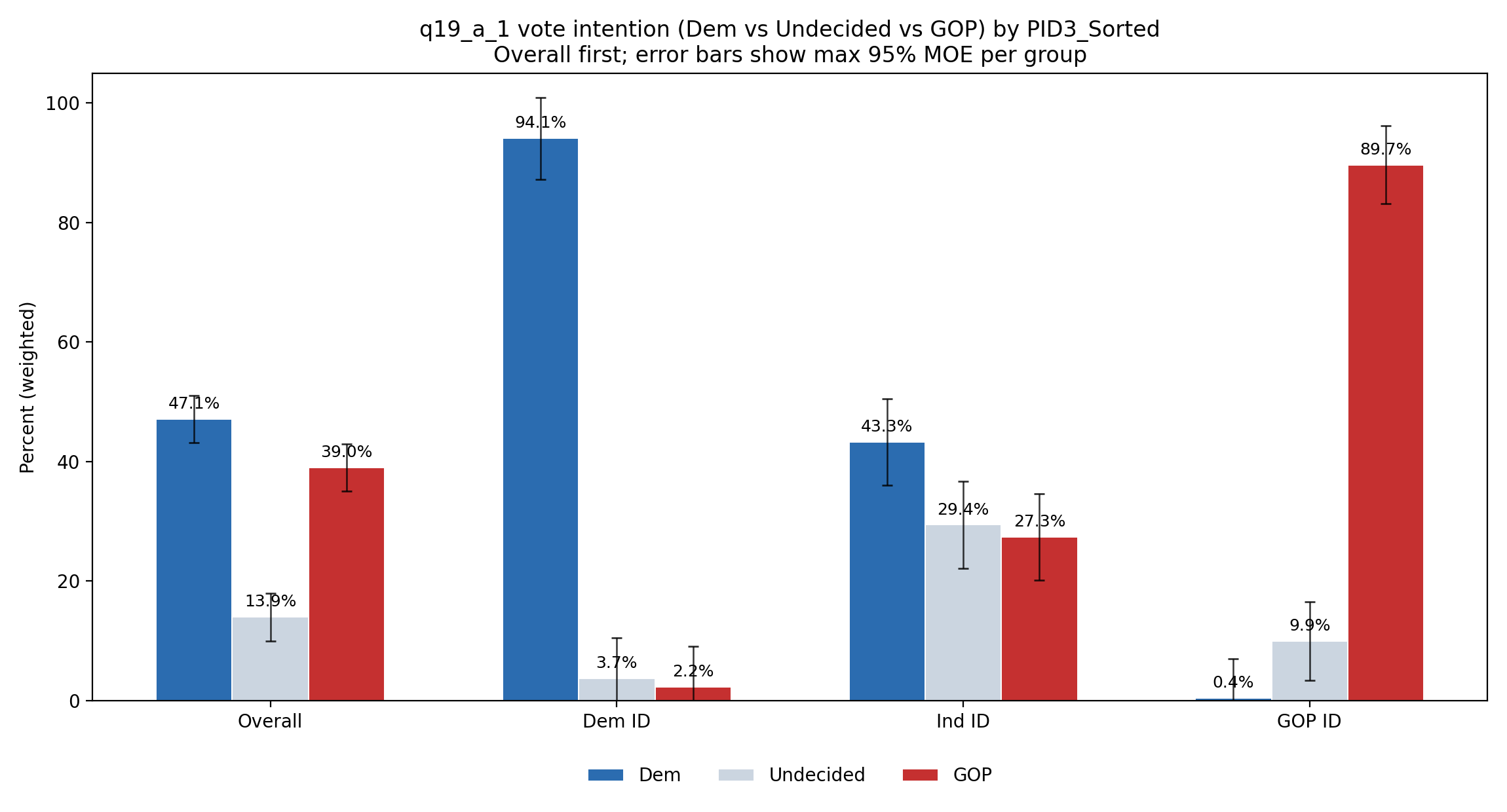 But when looking at the partisan identification, we see some distinctiveness when it comes to voter intention. Take for example the U.S. Senate generic ballot contest (broken into “definitely/likely voting for Democratic candidate vs. undecided vs. definitely/likely voting for Republican candidate”1): we see clear partisan loyalty among those who self-identify as Democratic and Republican, while those who said they were ‘independent’ are more divided, but lean towards one party.